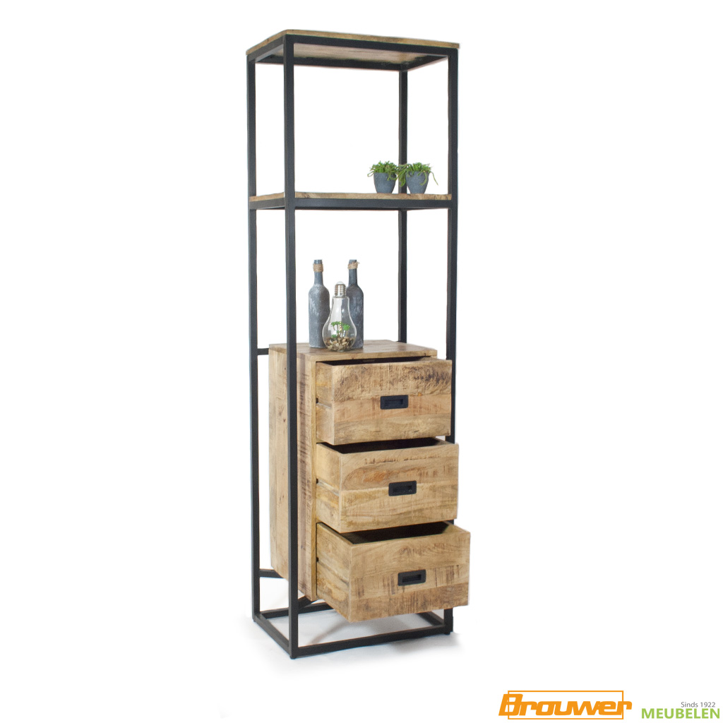 Boekenkast Float heeft een speelse uitstraling dankzij het zwevende midden blok. Hij is 60 cm breed, 45 cm diep en 200 cm hoog. Onder het zwart metalen frame zitten handige steldopjes. Verder is hij gemaakt van mangohout en heeft hij 3 lade met daarboven 2 open vakken. Het mangohout is gelakt en het metaal gepoedercoat.
