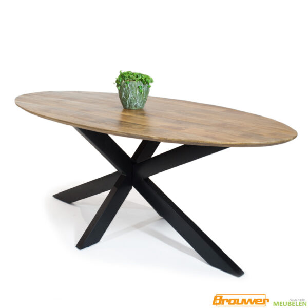 Deze ovale eetkamertafel is gemaakt van mangohout met een verjongd blad (afgeschuinde rand) van 4 cm. Hierdoor krijgt hij een ruimtelijk effect in tegenstelling tot andere mangotafels. De poot die voorzien is van steldopjes is gemaakt van zwart gepoedercoat metaal. De Bibi ovale tafel is verkrijgbaar op 210×100 cm en 240×110 cm. Hij is 76 cm hoog.