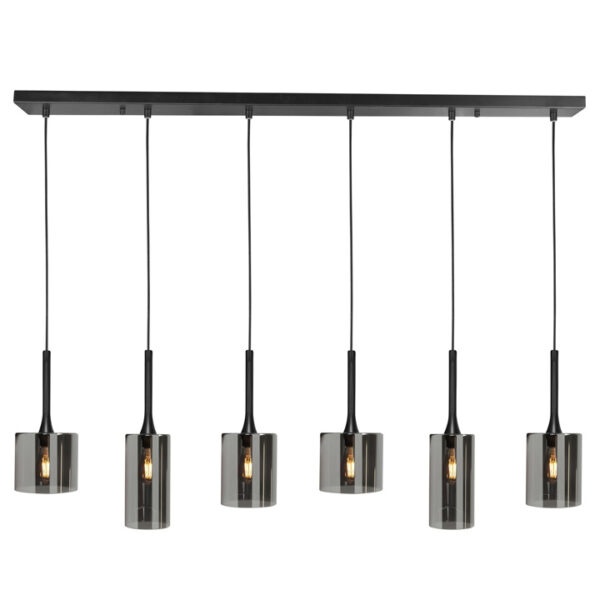 Deze 6-lichts zwarte hanglamp heeft 6 donkere glazen van glas. De glazen zijn op verschillende hoogtes mogelijk, tot maximaal 160 cm. Doordat de lamp open is aan de onderkant geeft hij goed licht naar onder maar omringend geeft hij weer sfeervol licht De lamp is extern dimbaar.