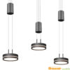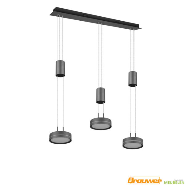 Moderne hanglamp van metaal en aluminium in antraciet kleur. De 3 lampen zijn makkelijk verstelbaar in hoogte deze zijn voorzien van een 9 Watt LED lichtbron. Verder is de Roosevelt 85 cm breed en hebben de kappen een diameter van 14 cm.