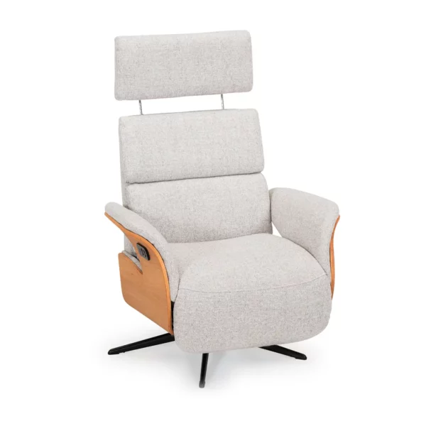 Katelyn combineert elegant design met ultiem comfort. Sierlijke houten accenten aan de zijkanten geven de stoel een warme, natuurlijke uitstraling die perfect past in zowel moderne als klassieke interieurs. De verstelbare hoofdsteun zorgt voor een optimale ondersteuning van hoofd en nek, ideaal om te lezen, ontspannen of een dutje te doen.