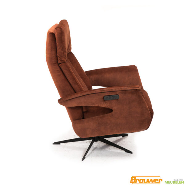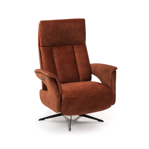 Hippe relaxfauteuil met een metalen zwarte stervoet. Afgebeeld in velvet adore, kleur copper. De Lund is leverbaar als manueel of elektrisch (2 motorig) Daarnaast is er keuze uit vele materialen en kleuren. Ook kan de poot naar wens worden gekozen bijvoorbeeld een RVS schaal of een houten stervoet. De Lund is voorzien van een topswing (handmatig hoofdgedeelte)