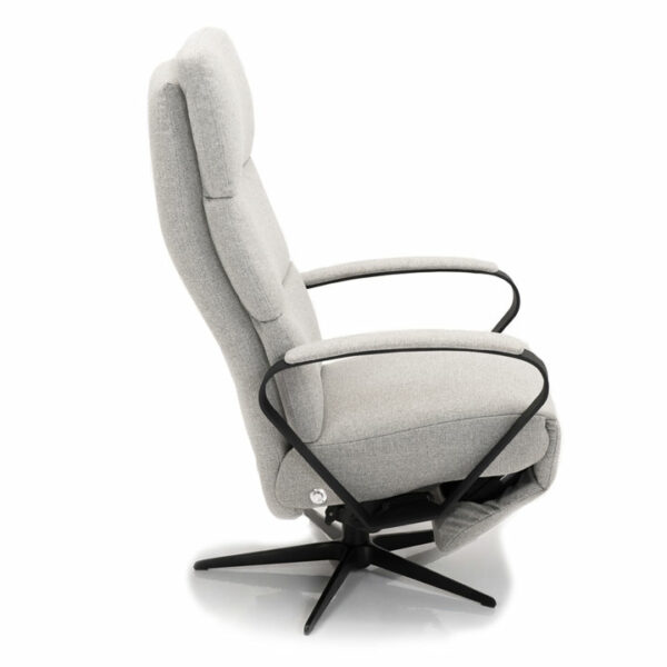 Heerlijke relaxfauteuil met een stoer karakter dankzij de zwarte stalen armleggers. De fauteuil heeft een verstelbare rugleuning en voetsteun voor een totaal ontspannen gevoel.
